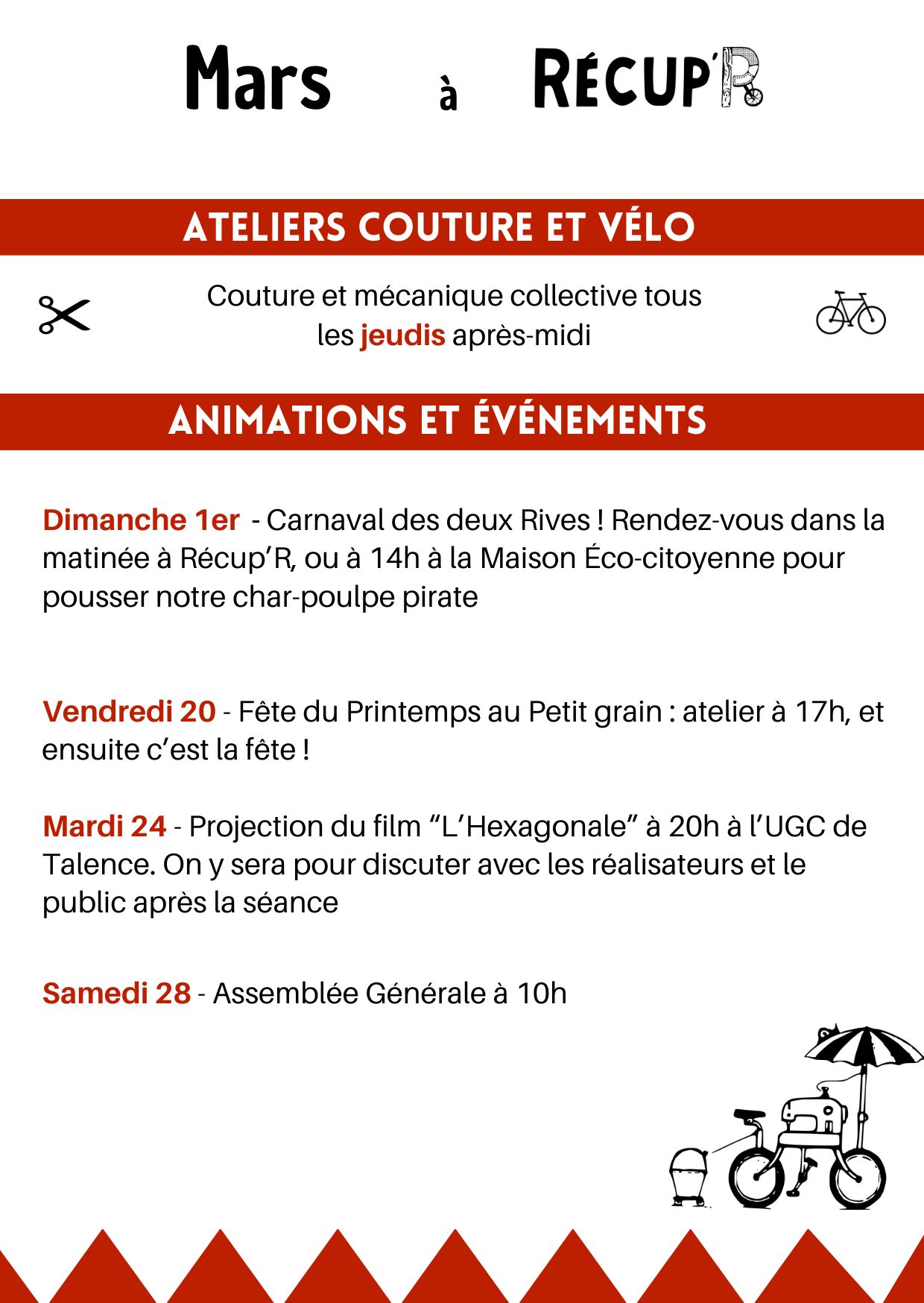 Les horaires des permanences vélo/couture sont pour l'autoréparation. Pour les dons et achats de vélo (et tissus), vous pouvez passer tous les après-midis du mardi au samedi